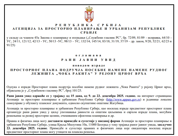 Agencija za prostorno planiranje i urbanizam Republike Srbije uklonila je oglas o ranom javnom uvidu sa zvaničnog sajta usred postupka, koji traje do 23.12.2025. godine.